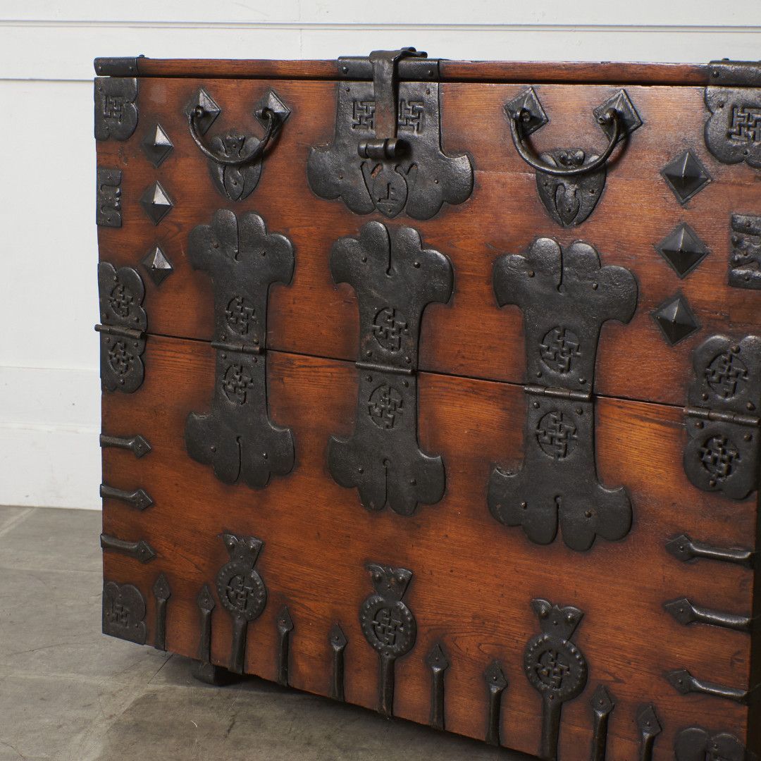 - 美術品・アンティーク・コレクション > 家具 > 李朝家具 錠前 バンダジ 時代箪笥 朝鮮家具 半閉櫃 収納 整理 引き出し 民藝 李朝家具 無垢材 古鉄金具 半閉櫃 バンダジ 半閉じ箱 時代物 朝鮮 収納
