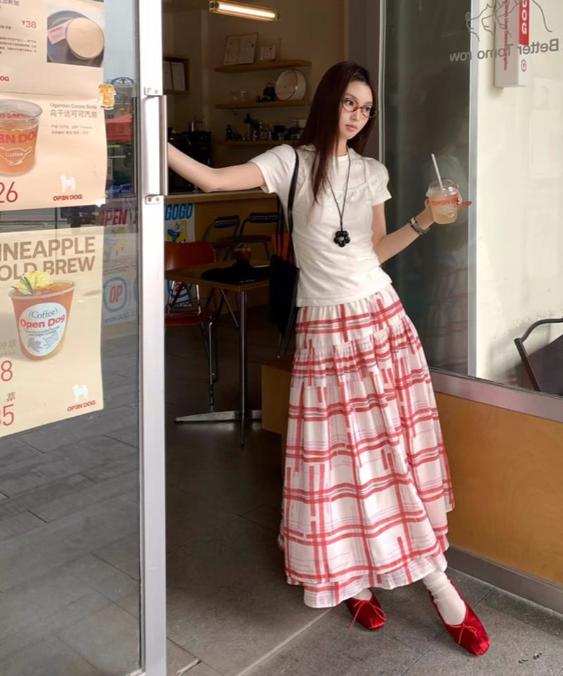 | メーカー | 赤と白のチェック柄フレアロングスカート 予約販売】レトロチェック柄フレアスカート |