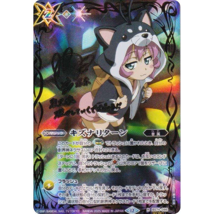 | 商品の特徴 | 声優箔押しサイン入り】バトルスピリッツ BS74-086 キズナリターン。2025/12)(SECRET)キズナリターン(サイン箔押し/黒田環奈イラスト)【R。SECRET】【箔押しサイン】BS74-086キズナリターン R 【黒田 環奈。SECRET】【箔押しサイン】BS74-086キズナリターン R 【黒田 環奈。未使用品ですがトラブル防止のため初期傷などを気にされる方はご遠慮くださいバトルスピリッツ バトスピ | ||