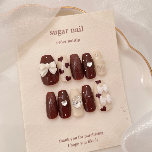 | メーカー | 【オーダー】ネイルチップ ボルドー キラキラリボン手書きハート ワンホン韓国 ネイルチップ |