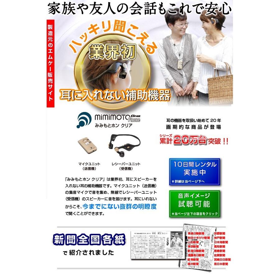 - 看護・介護用品 > 自助具・リハビリ用品 > ○本体未開封 みみもとホン クリア ES-700GU 耳に入れない集音器・助聴器 耳に入れない集音器・助聴器 みみもとホン クリア ES-700GU : エムケー